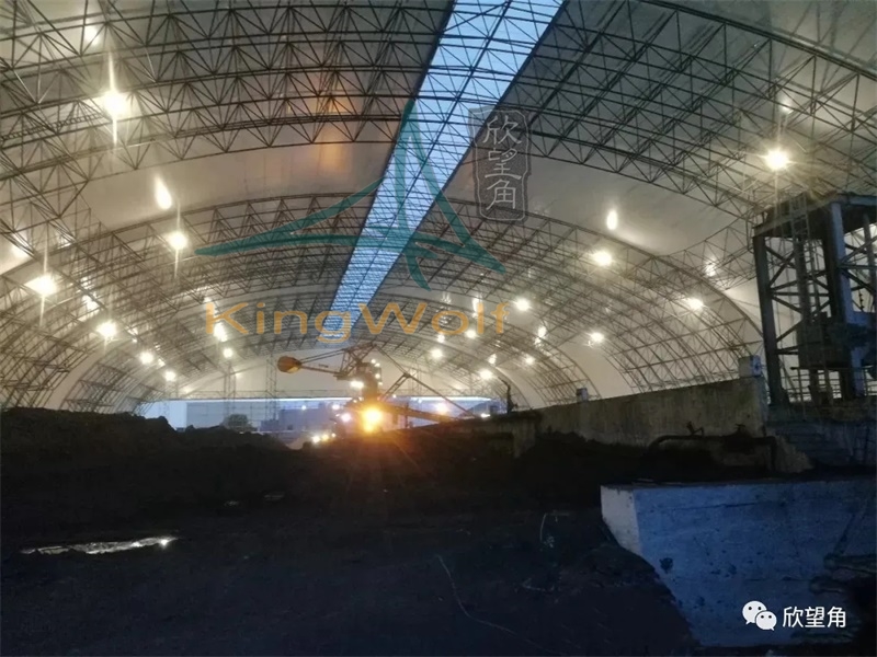 该项目采用膜结构代替彩板,创造煤场网架膜结构最大跨度第一个工程,属国内外首创。膜耐冷热抵御紫外线照射,不褪色,不粉化,使用寿命长,耐腐蚀。而且,该材质单位面积重量轻,网架总体重量降低,有效降低了投资。该项目首次采用大面积抽空网架,造价低,安全可靠。