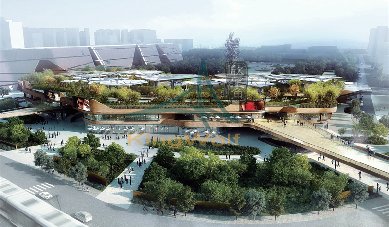 本项目利用下沉式广场、开放式生态屋顶、艺术型景观坡地以及层楼结构设计,形成了多首层以及错落有致的视觉观感,特别是从龙城广场的角度看过去,项目显得十分大气。