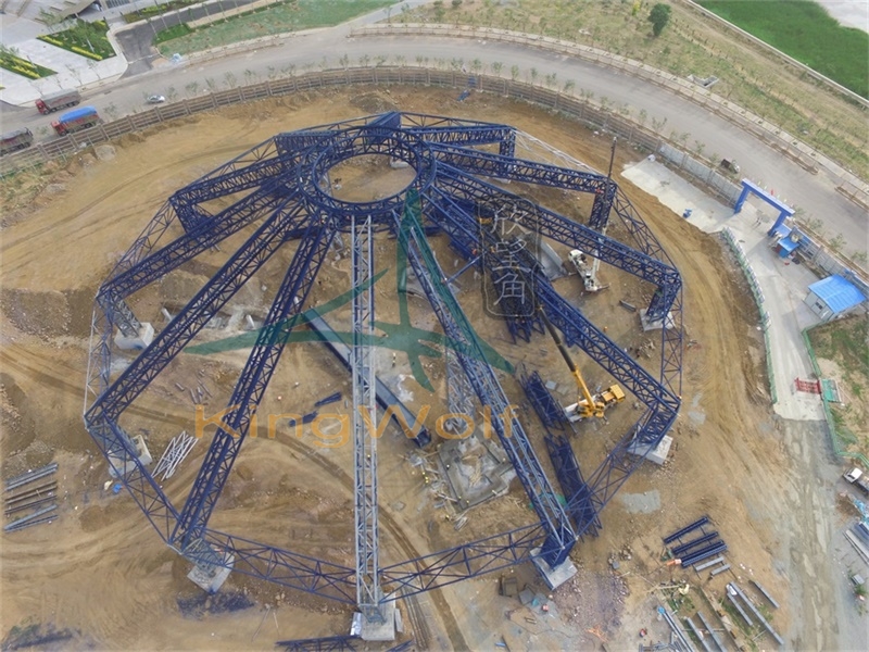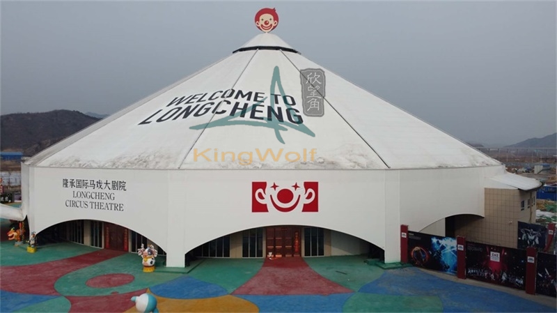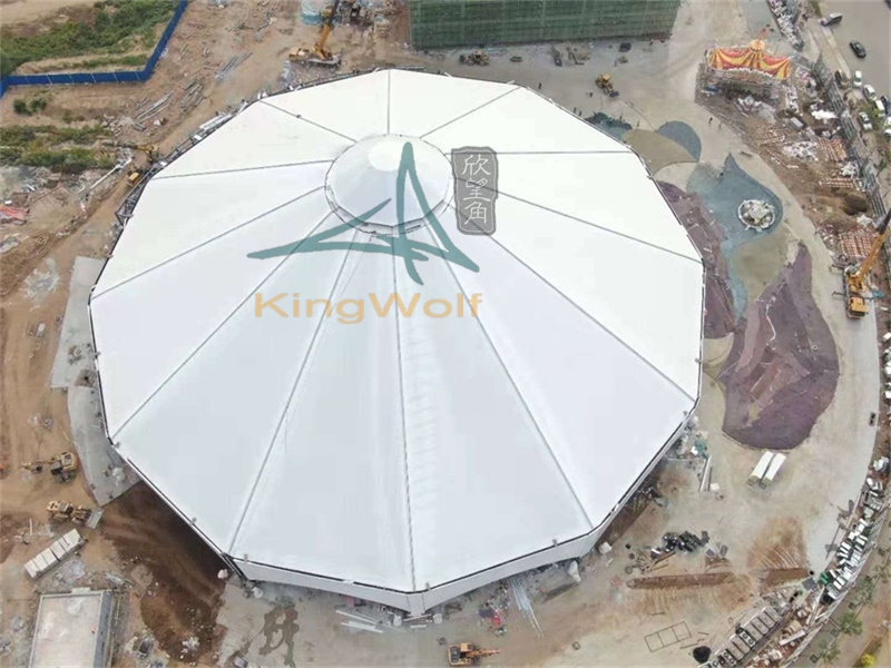 马戏馆在2019年四月下旬动工,主体是钢结构,用钢量950T,2019年7月1日主体钢构完成。跨度大,直径108米,高度45米,钢和膜的主体完工是7月20日,施工周期短,用钢量大,零事故。它的外膜采用法国法拉利PVDF膜材,膜用料面积4.2万平方米。