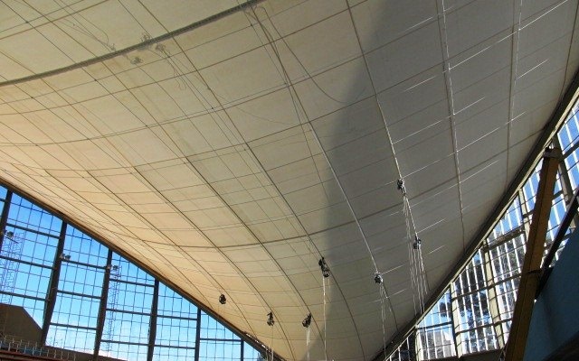 膜材就是氟塑材料表面涂层与织物布基按照特定的工艺粘合在一起的薄膜材料。常用的氟塑材料涂层有PTFE(聚四氟乙烯)、PVDF(聚偏氟乙烯)等。织物布基主要用聚酯长丝(涤纶PES)和玻璃纤维有两种。